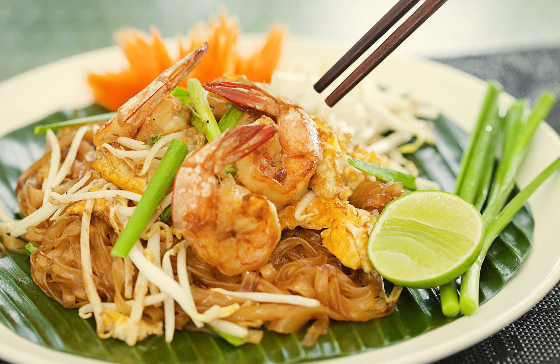Stir fry rice noodles, egg, beansprout, and crushed peanut topped with colossal shrimp